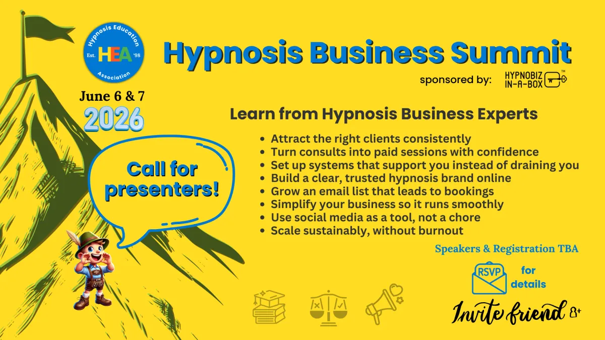 The HEA Hypnosis Business Virtual Summit is a focused, practitioner-centered event created specifically for hypnotists who want their work to be impactful and profitable, without burnout. This is not generic business advice repackaged for hypnosis. It is real-world strategy, taught by hypnosis professionals who have built successful practices and are willing to share what actually works. Over two powerful days, you will gain practical insights, tools, and perspectives you can apply immediately to your hypnosis business, whether you are just getting started, feeling stuck, or ready to grow with more ease and clarity.